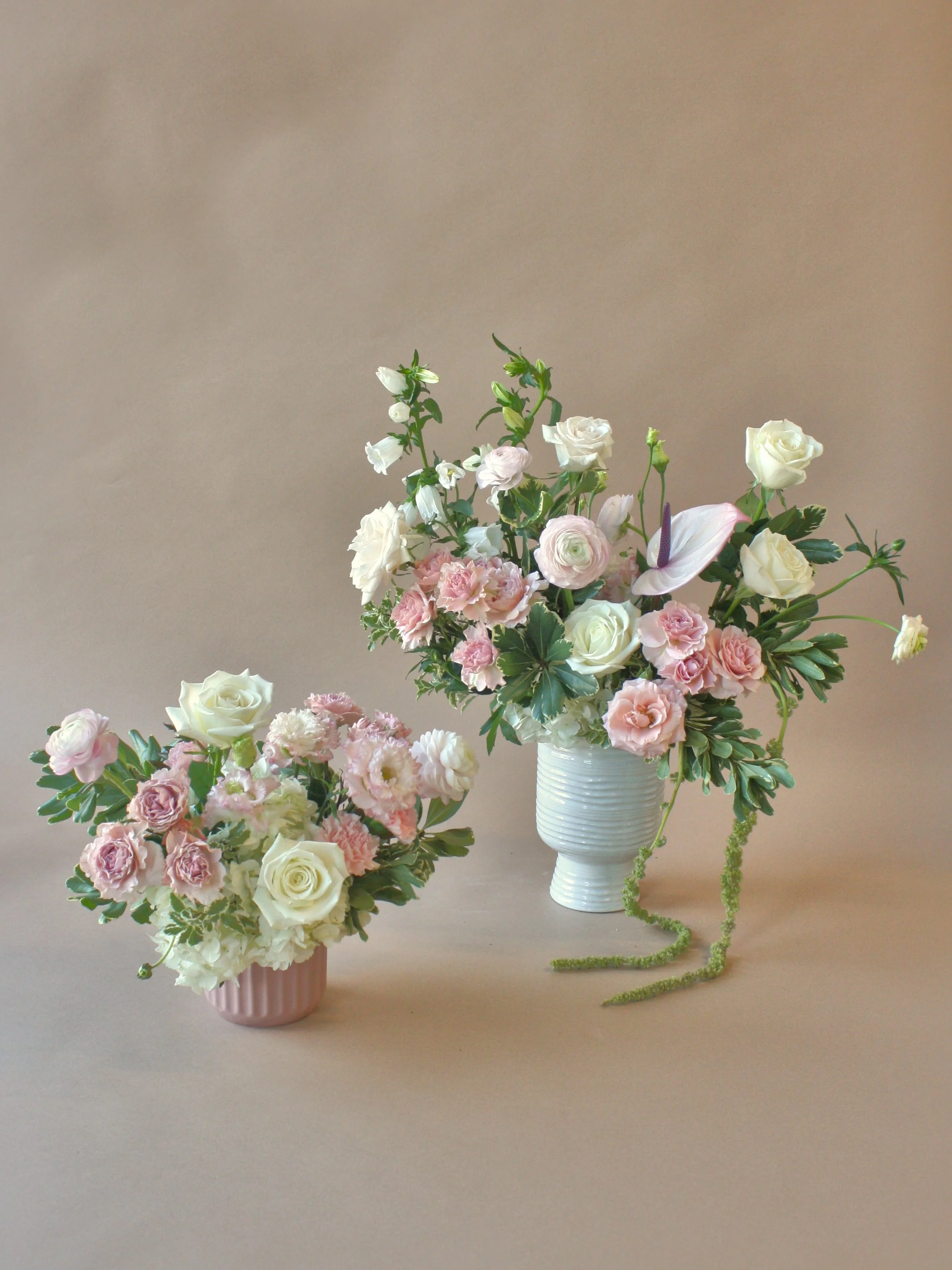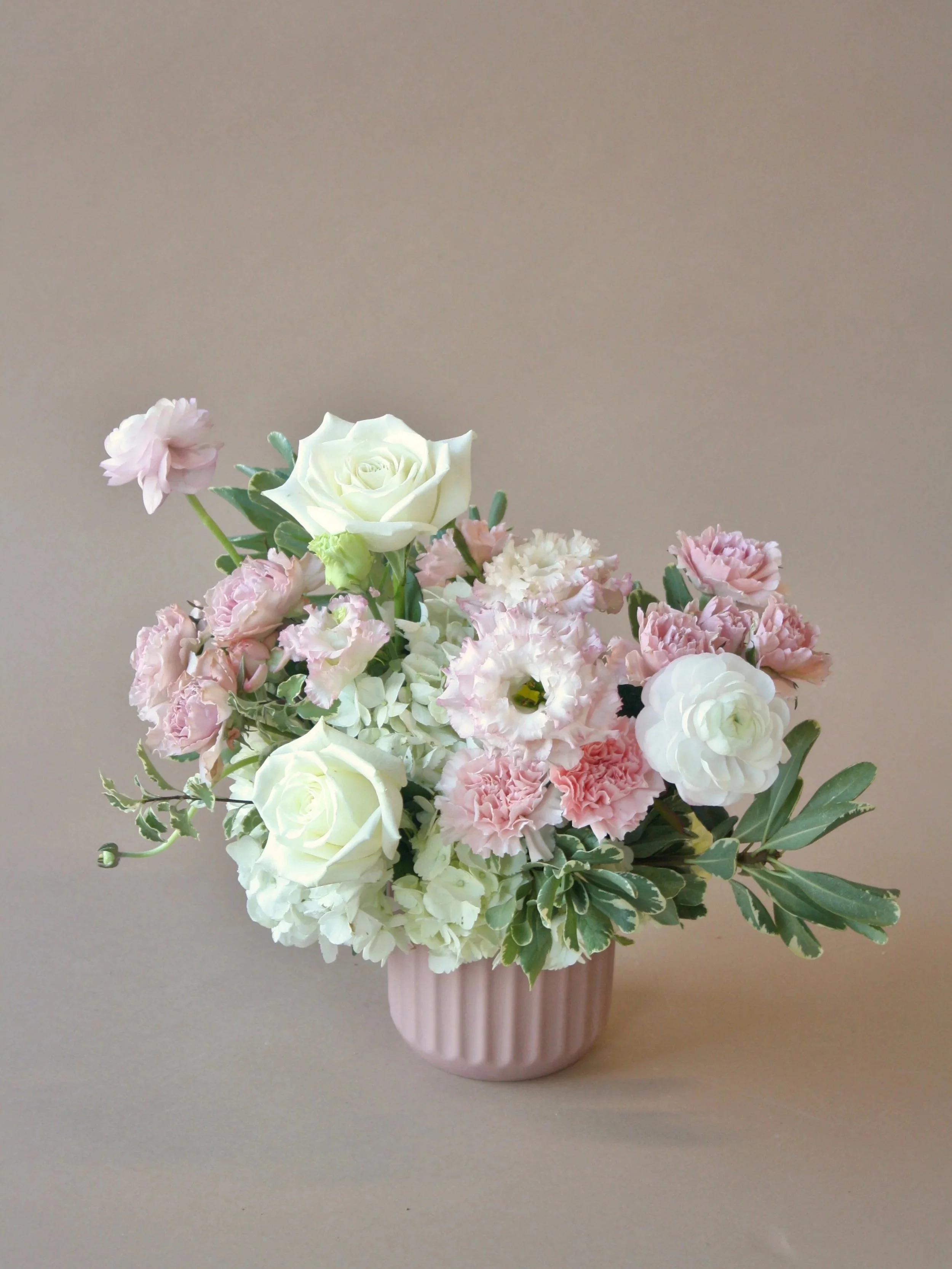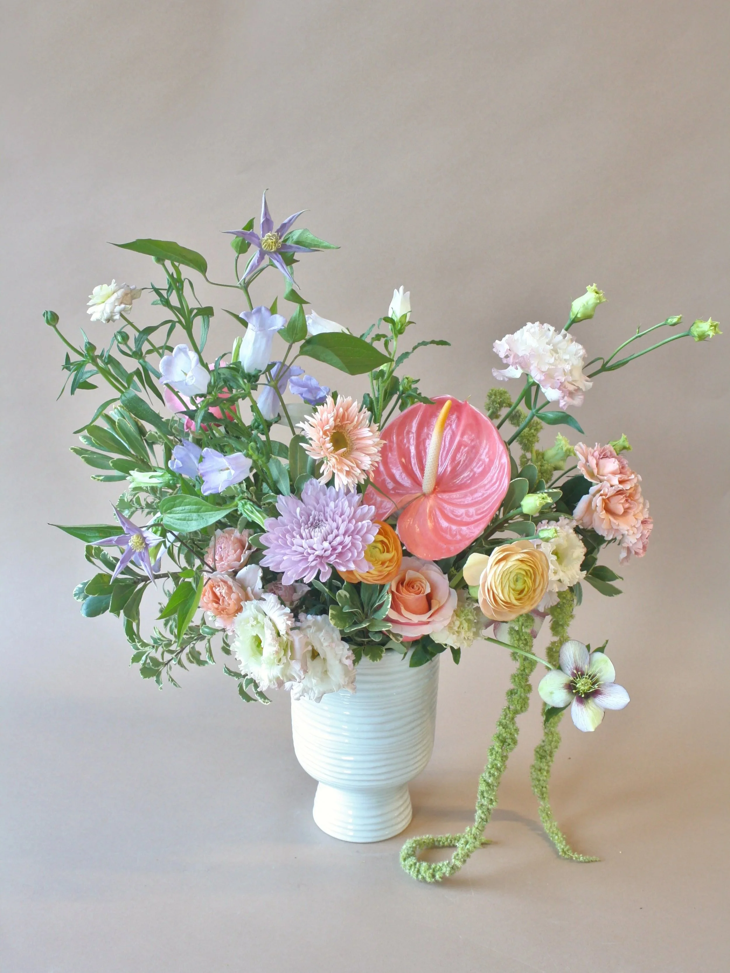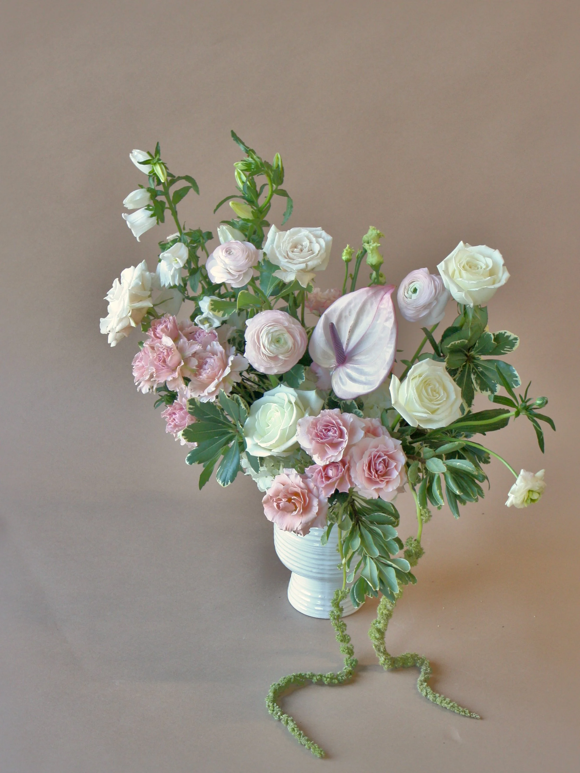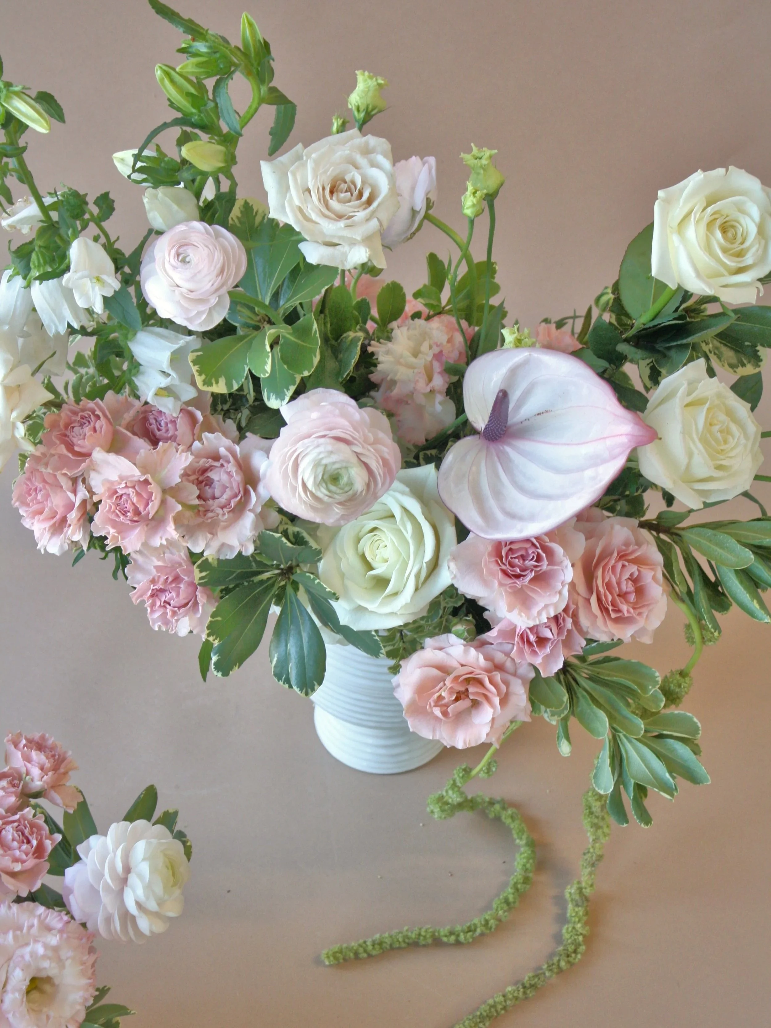 The UR Sweet arrangement will feature soft layers of cream, white, light pink, and blush. Blooms may include anthurium, ranunculus, roses, spray roses, amaranthus, garden roses, butterfly ranunculus, lisianthus, specialty carnations, and more. ♡Vases and blooms may vary ♡