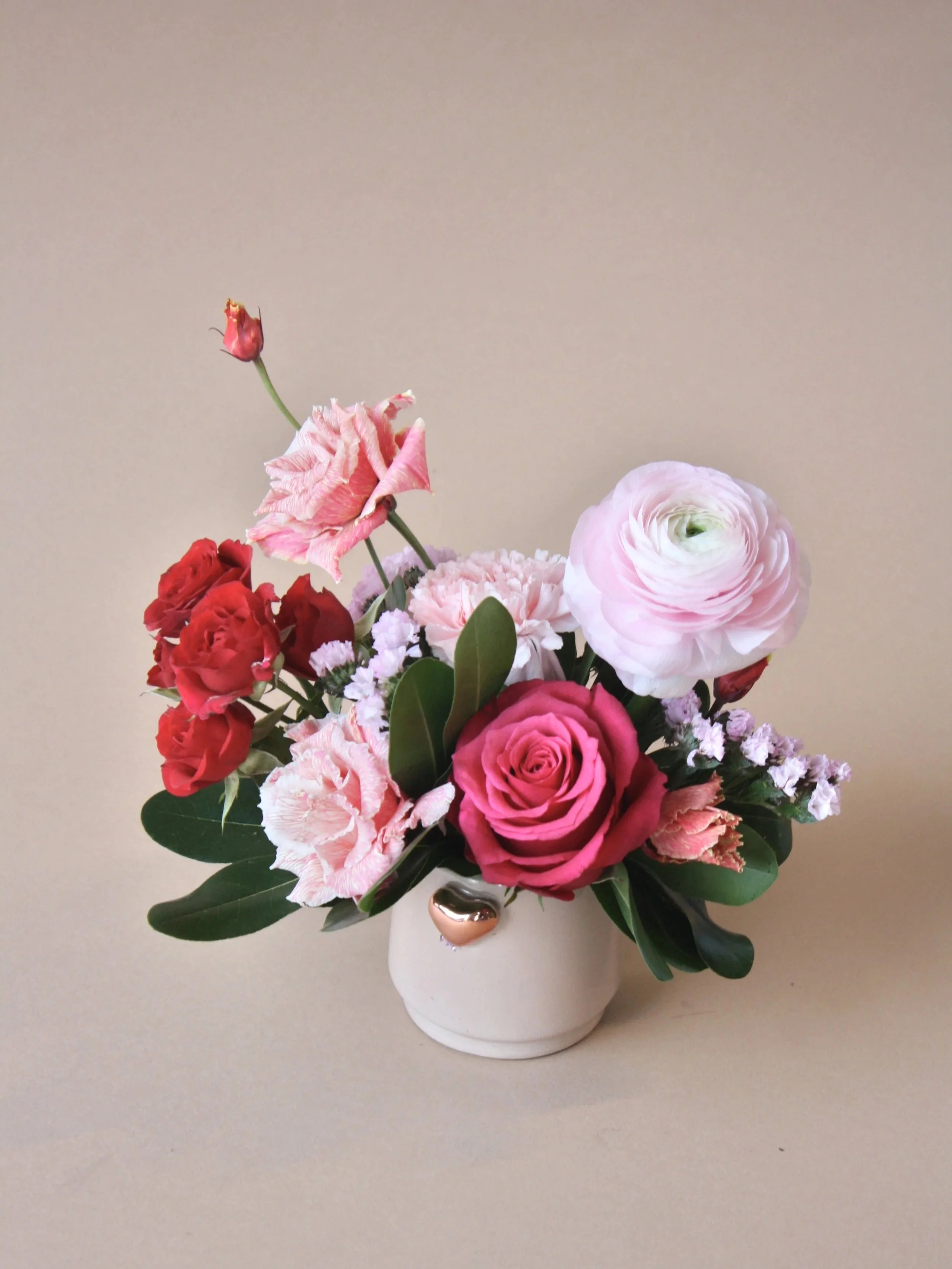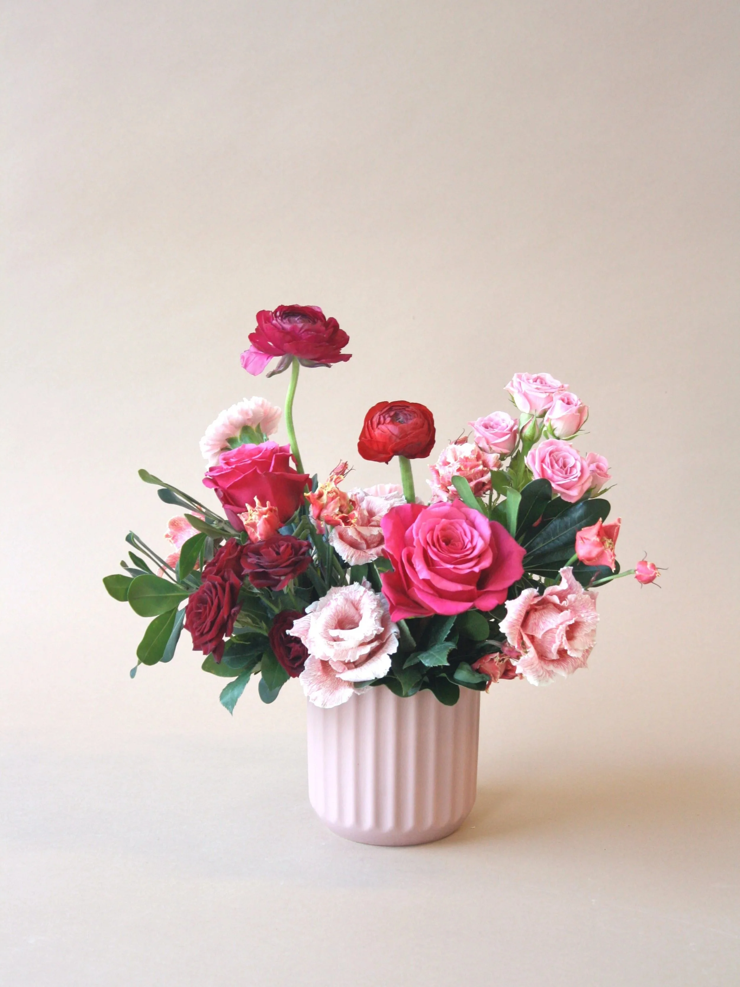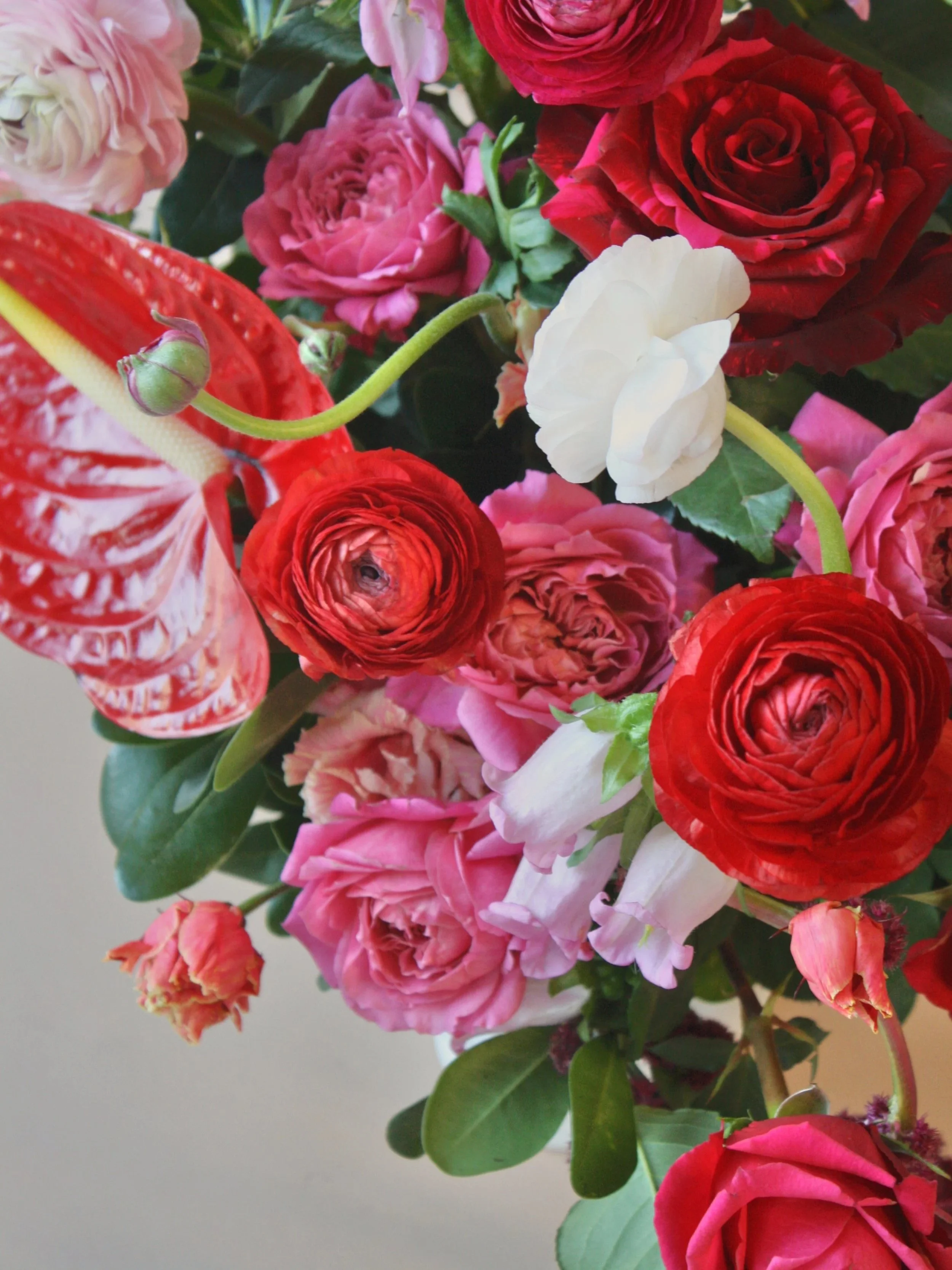 The XOXO arrangement is Nectar’s take on a classic Valentine’s arrangement with layers of reds and pinks. Blooms may include anthurium, ranunculus, roses, spray roses, amaranths, lisianthus, specialty carnations, campanula, and more. ♡Vases and blooms may vary ♡