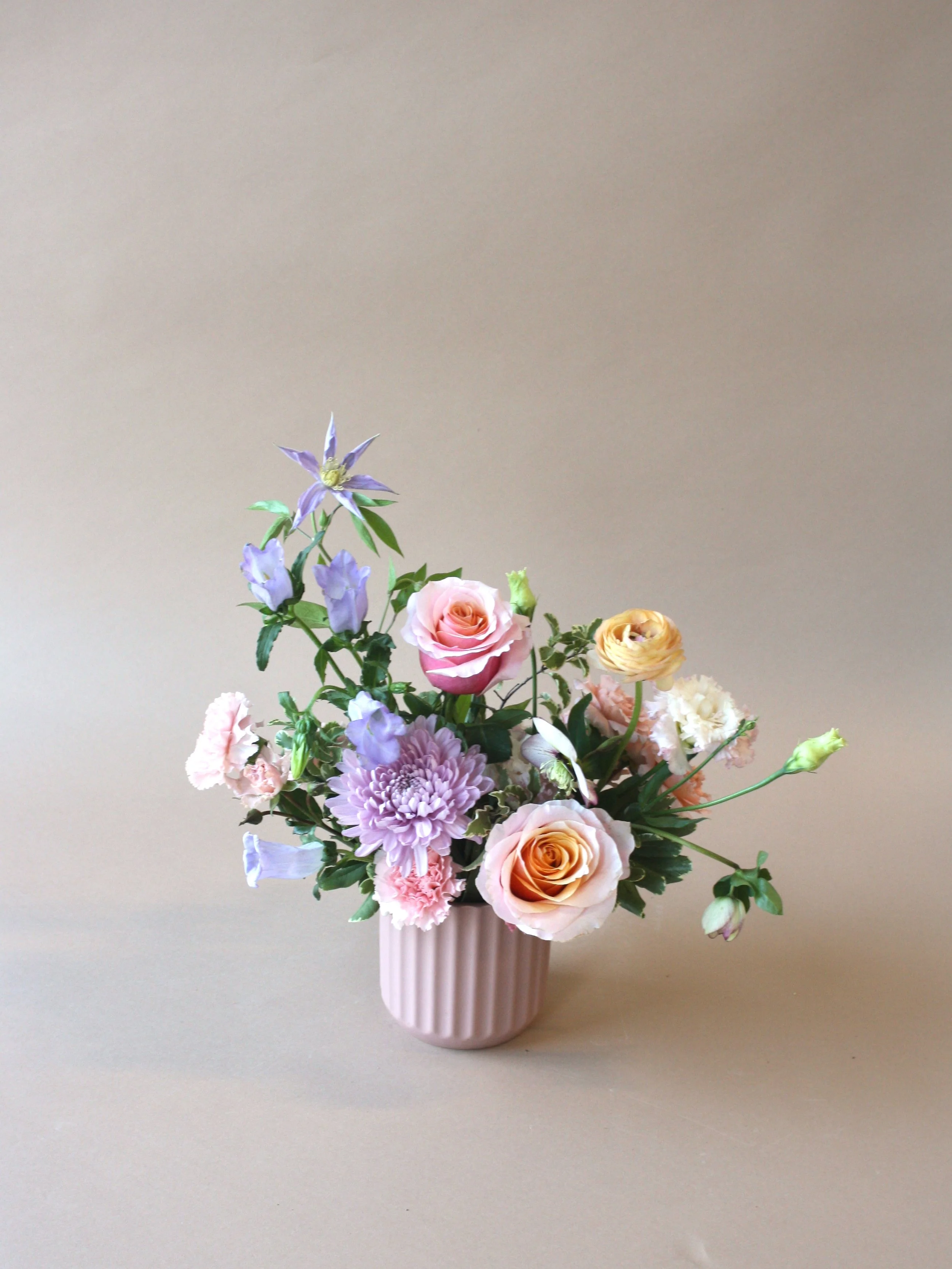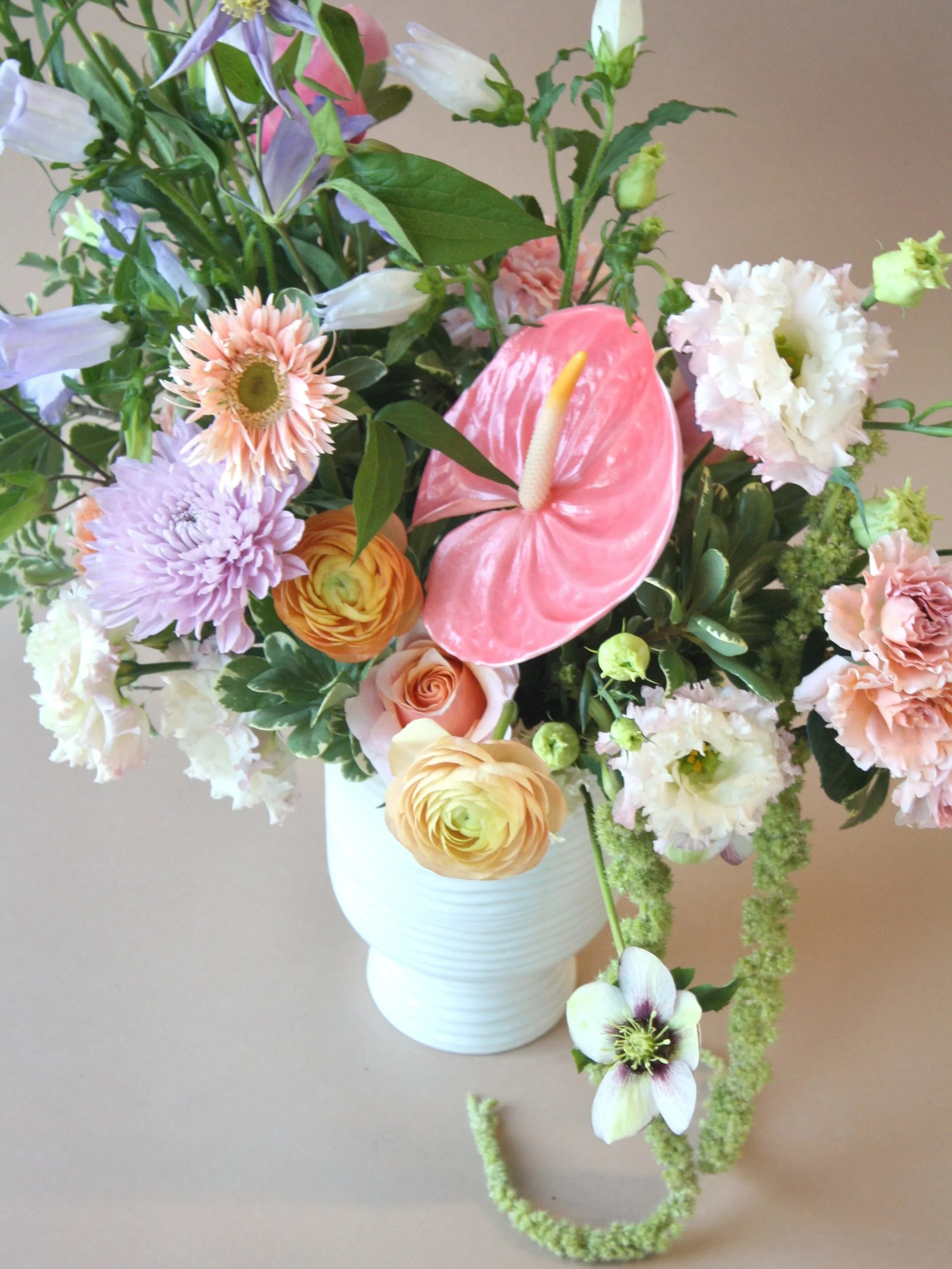 The Be Mine arrangement is a fun mix of pastel lavender, pink, and peach with accents of sunny orange-yellow. Blooms may include anthurium, ranunculus, roses, spray roses, amaranthus, hellebore, clematis, lisianthus, specialty gerbers, specialty disbuds, and more. ♡Vases and blooms may vary ♡